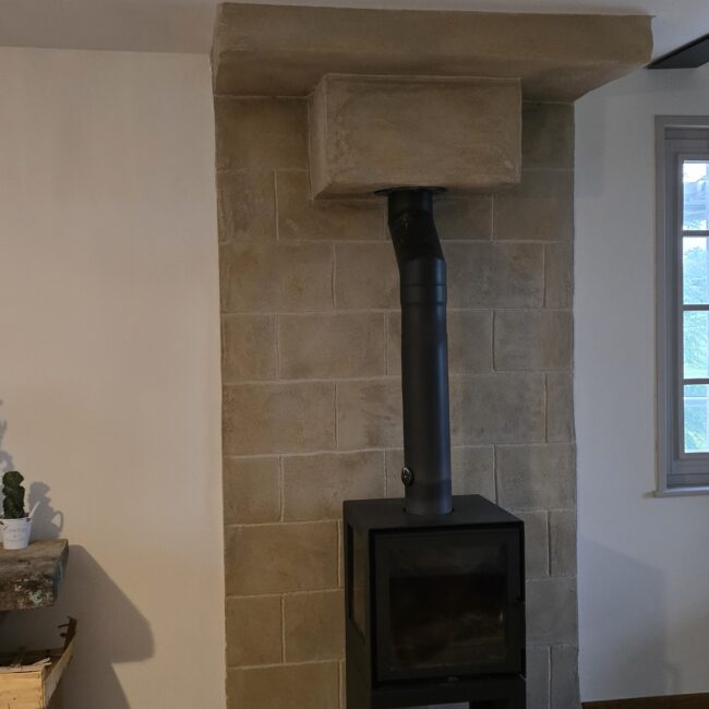 Ce style est réalisé avec un enduit à la chaux sculpté à la main pour imiter la pierre naturelle.